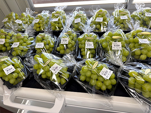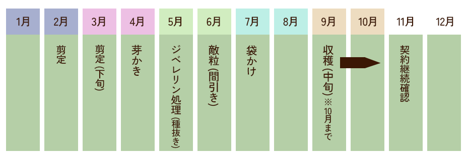 ぶどう狩りをする シャインマスカットのオーナーになる シャインマスカットのオーナーになる オーナー制度 MEMBERSHIP 樹ぶどう園では、シャインマスカットのオーナー様を募集しています。剪定・間引き・袋かけなどを体験して頂き、ご家族・ご友人と、ぶどうを育てる楽しみと収穫の喜びを味わえます。 サービス内容 品種契約年数収穫時期契約本数房数料金(税込) シャインマスカット1年更新9月中旬~10月1樹40~50房80,000円 品種 シャインマスカット 契約年数 1年更新 収穫時期 9月中旬~10月 契約本数 1樹 房数 40~50房 料金(税込) 80,000円 栽培体験 剪定・花切り・間引き・袋かけなど栽培をご家族やご友人と体験ができます。経験がなくても、農園スタッフがサポートしますのでご安心ください。 収穫体験 収穫をご家族やご友人と体験ができます。こちらも農園スタッフがサポートしますので初めての方でもご安心ください。 梱包して大切な方へ送ります 収穫したぶどうは箱に詰めて農園からお送ります。 ※送料、箱・梱包資材は別途掛かります。発送は全国対応しております。 育成状況のお知らせ 成育状況・収穫適期はホームページの「お知らせ」からいつでもご確認いただけます。 樹にプレートを付けて名前付けができます。 年間を通しての管理はもちろん、ご都合が合わなくて栽培体験ができない場合、スタッフが収穫まで大切に育成いたします。 収穫に来ることができない場合、スタッフが代理で収穫し、箱詰めしたぶどうを発送いたします。 スケジュール よくある質問 申し込みをしたいのですが、どうすればよいですか? 新規のお申込みは通年承っております。お気軽に問い合わせフォームよりご連絡ください。樹の本数には限りがあり、受付できかねる場合もございますのでご了承ください。 栽培(または収穫)体験をしたいのですが、どうすれば良いですか? 予約制となりますので、事前にメールもしくは電話でご連絡ください。参加人数は3人までとなります。トラブル防止のため、オーナー様は必ず同伴ください。 栽培、収穫体験は一切しなくても大丈夫ですか? はい、問題ありません。こちらで責任を持って栽培・収穫いたします。収穫したぶどうをお送りする際の送料、箱(2~3房入り)梱包費資材費(550円)は別途掛かりますので、ご承知おきください。 毎年必ず同じ量の収穫ができますか? 房数は例年通り収穫できた場合の予想数であり、気候等の影響で多少前後する場合がございます。 天候不良でぶどうが育たなかった場合はどうなりますか? 著しく収穫量が少ない場合は、例年の収穫量と同等量を保証いたしますので、ご安心ください。 お知らせ NEWS 樹ぶどう園の情報を発信中です。オーナー様のシャインマスカットの栽培状況もこちらからご確認いただけます。 栽培報告 2026-02-15 【育成報告】袋かけ作業 現在の育成状況のお知らせです。 現在は袋かけ作業を・・・ ・・・・・ ・・・・・ ・・・・・ お知らせ 2026-02-15 ○月のお休み ○月のお休みは下記の通りです。 ○日 ○日 ○日 よろしくお願いします。 ぶどう狩り GRAPE PICKING 樹ぶどう園では、シャインマスカットのぶどう狩りを体験いただけます。自然の中で心も体もリフレッシュできます。 サービス内容 品種受付時間入園料:大人入園料:子供収穫時期持ち帰り料金(税込) シャインマスカット13:00~500円300円9月中旬~量り売り100g 300円 品種 シャインマスカット 受付時間 13:00~ 入園料:大人 500円 入園料:子供 300円 収穫時期 9月中旬~ 持ち帰り料金(税込) 量り売り100g 300円 作業は野外のため、熱中症対策のための飲料水などをご持参ください。 園内で収穫したぶどうは、お会計後にお召し上がりください。 発送する場合、送料、箱・梱包資材は別途掛かりますので、ご承知おきください。 直売所 SHOP 樹ぶどう園で収穫されたさまざまな種類のぶどうを販売しております。もぎたての美味しいぶどうをぜひお楽しみください。 販売品種 シャインマスカット 巨峰 長野パープル 富士の輝き BKシードレス マスカットノアール ブラックビート クイーンニーナ クイーンマスカット 美和姫